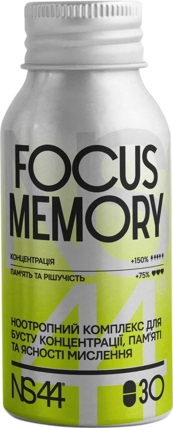 NS44 не просто “бадьорить”. Це комплекс, який дає керовану енергію, стабільний фокус і підтримку памʼяті завдяки ноотропній базі (їжовик 40% полісахаридів + цитиколін) і м’якому балансуванню стимуляції (L-теанін, магній, B6/B12).